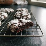 A pile of dark chocolate crinkle cookies with white powdered sugar cracks on a cooling rack.
