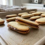 - Spread a generous layer of chocolate on the flat bottom of one cookie and press another cookie on top to form a sandwich.