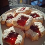 While the cookies cool, place your strawberry jam and lemon juice in a small saucepan over low heat. Stir them together until the jam is smooth and slightly runny. Dust all your ‘windowed’ top pieces generously with powdered sugar before assembly—this prevents the sugar from dulling the red jam. Place a small teaspoon of the warm jam onto the center of each solid base cookie. Gently press a sugar-dusted window piece on top. The jam will rise up into the cutout, creating a vibrant, fruity center.